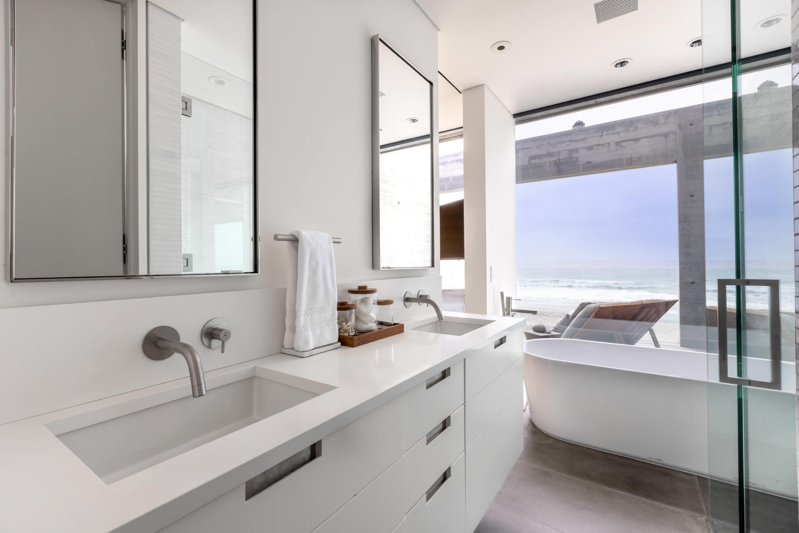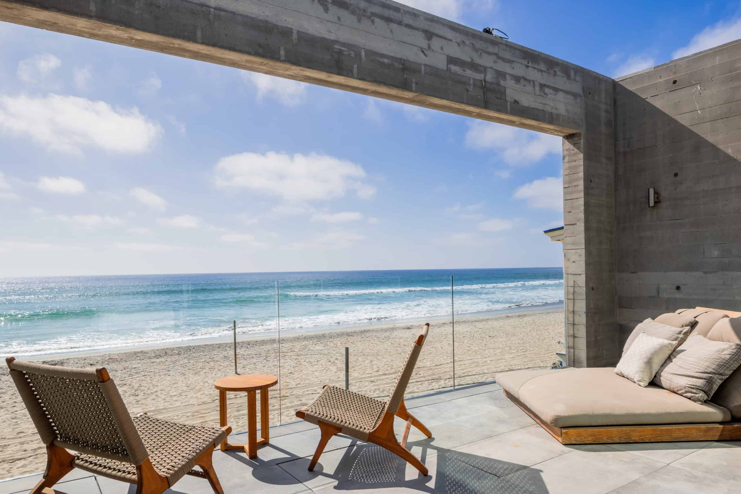 This 4-bedroom, 3.5-bath oceanfront home in Del Mar can comfortably fit up to 9 guests. The floor-to-ceiling glass windows bring in all the natural light to enjoy the perfect ocean view. Modern, spacious primary bedroom with oversized shower is the perfect way to rejuvenate after a long day at the beach. Three additional bedrooms and bathrooms invite the whole family to stay and commune, cooking together in the Chef’s kitchen, playing in the ocean, and enjoying the back patio at sunset.